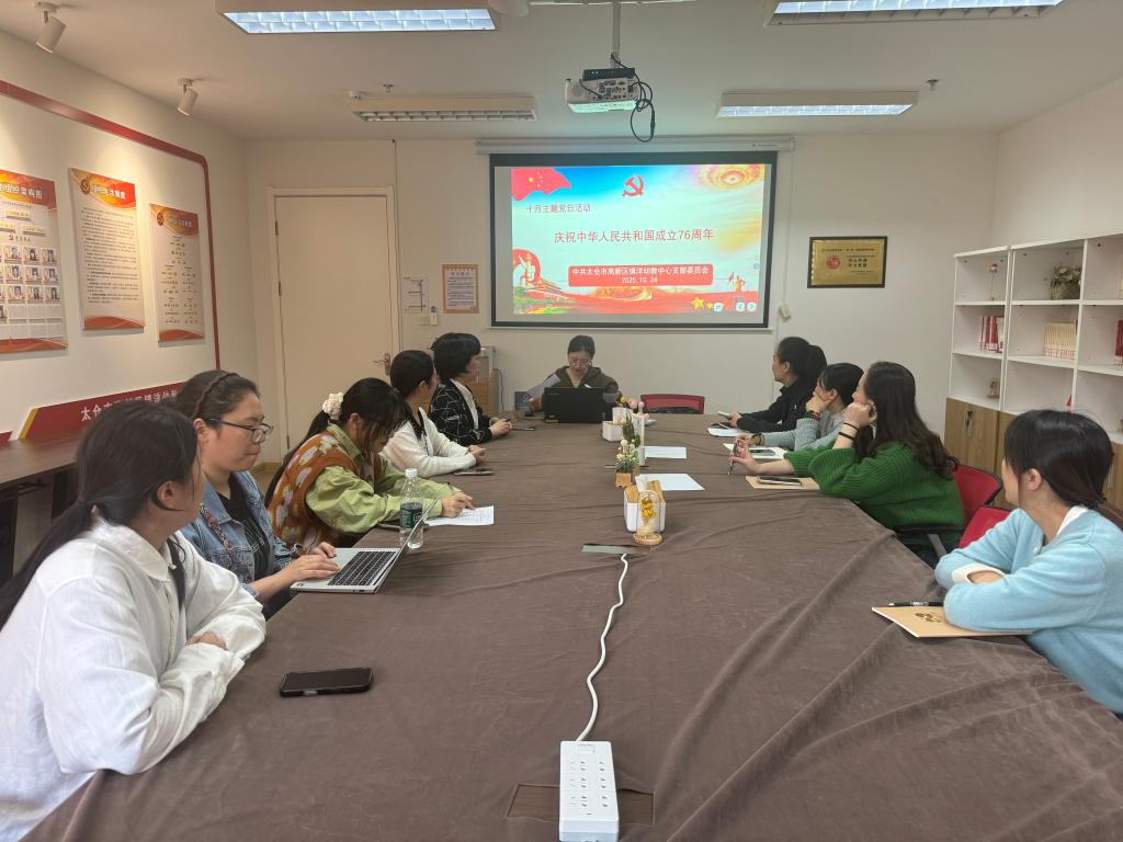 2025年10月24日下午,太仓市高新区镇洋幼教中心党支部在党建活动室开展“庆祝中华人民共和国成立76周年”主题党日活动,活动由党日主理人潘瑜同志主持,全体党员参加。