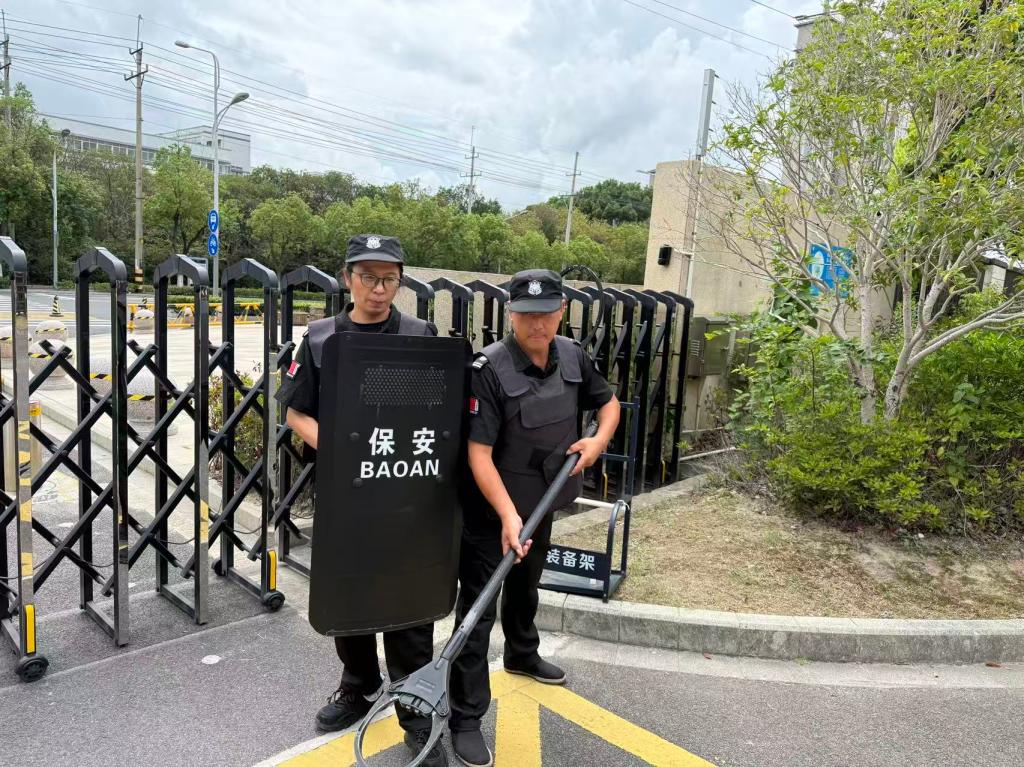 演练模拟“陌生人员强行闯入”,2名保安组成单元快速响应:1人启动一键报警并持防暴盾牌阻拦、通报教师,1人持防暴钢叉配合,1分20秒完成“阻拦-控制-警戒”,动作规范。